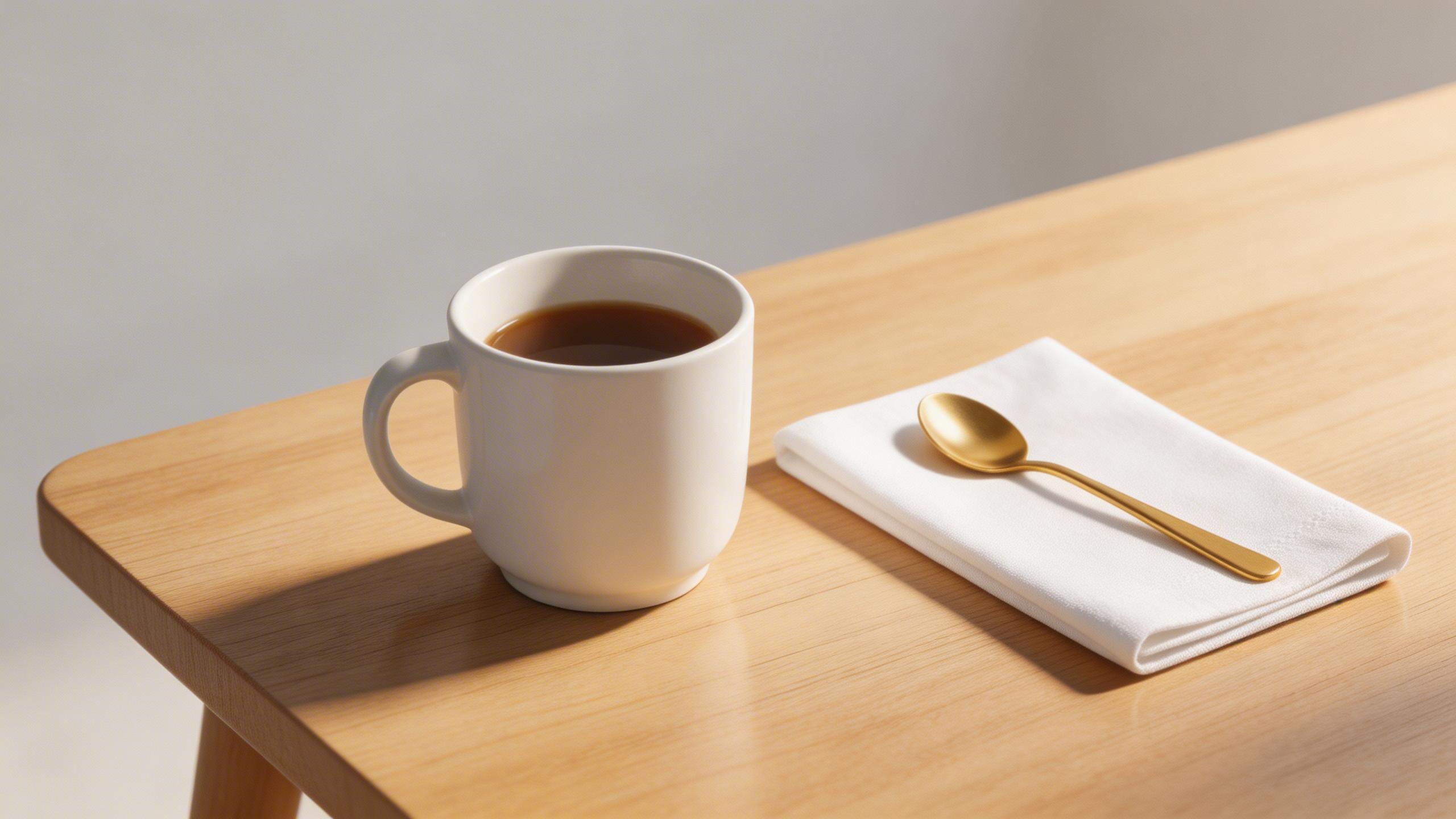 ✅ 正确示例:生成一张北欧风陶瓷咖啡杯,杯身为哑光白色材质,放置在浅色木质桌面上,旁边搭配折叠整齐的白色棉质餐巾和金色勺子,桌面上有柔和晨光斜射,形成自然阴影与光泽反射;拍摄角度为俯视45度,背景为浅灰色极简空间,整体风格为暖光极简写实,画面清晰,细节真实,确保无模糊或多余元素。