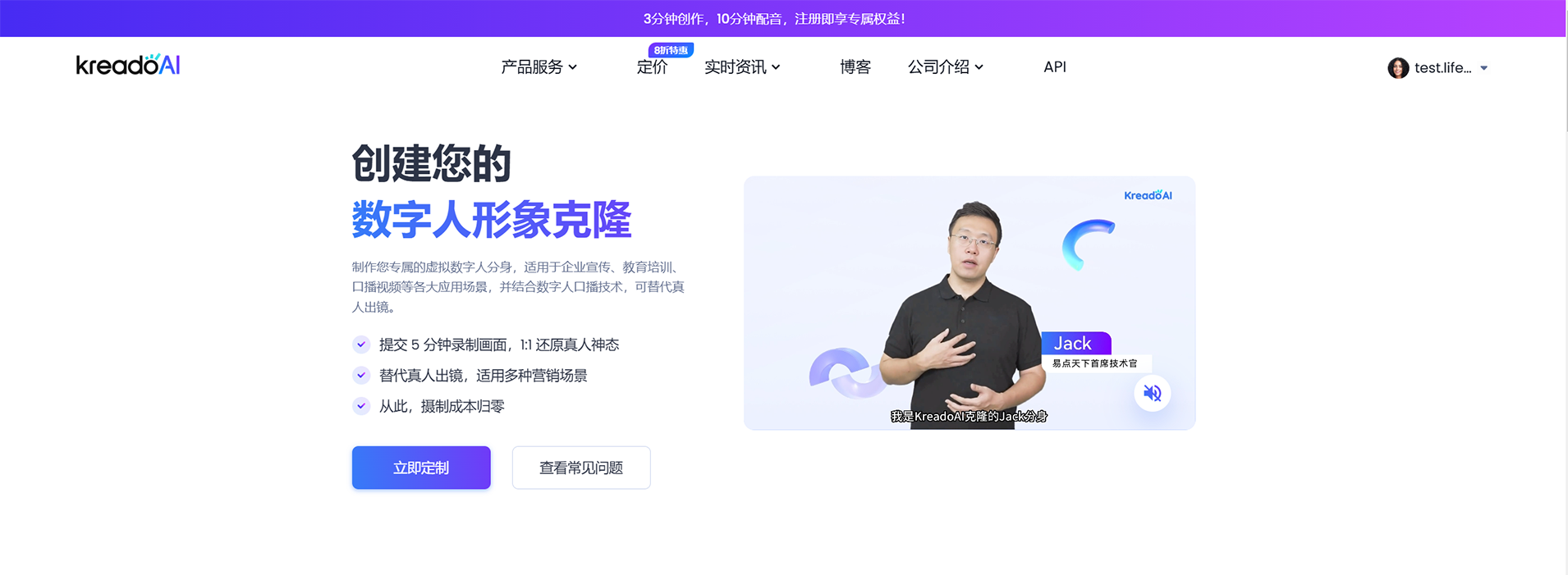 只需上传一段5分钟的录制视频,KreadoAI便能快速生成与你外貌高度相似的1:1AI数字人克隆——适用于社交媒体、品牌推广、AI视频创作等多种场景。
