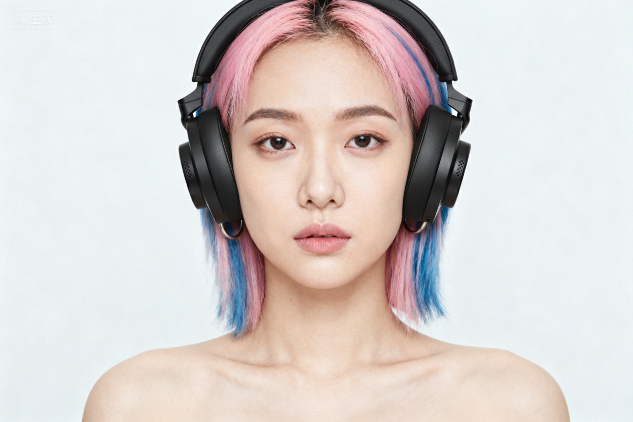 “把这两张图片融合,让模特佩戴耳机,保持原有光线和风格。