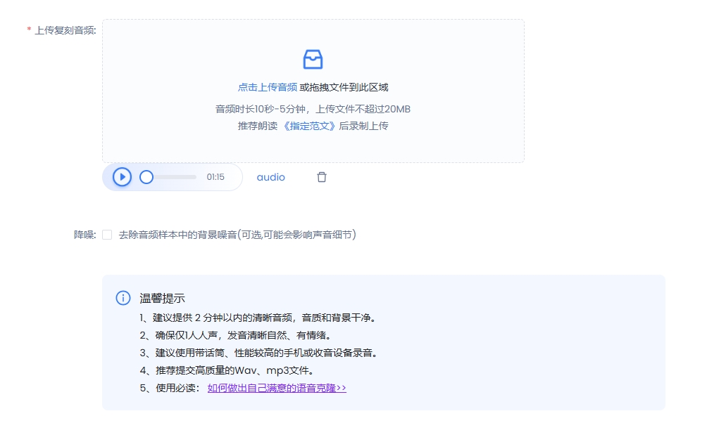 为了确保语音克隆的还原效果,上传的音频需要符合以下要求: