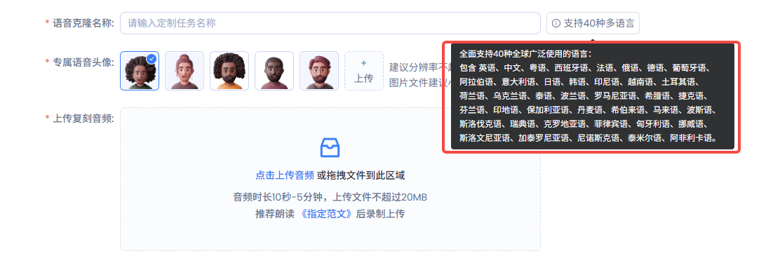 在“专属语音头像”中,选择或者上传一个个性化头像,方便识别你的克隆语音。