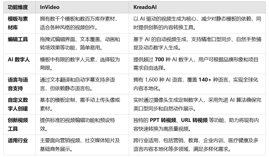 下表直观展示了 InVideo 与 KreadoAI 在关键功能上的对比,帮助用户从多个角度了解各自的特点: