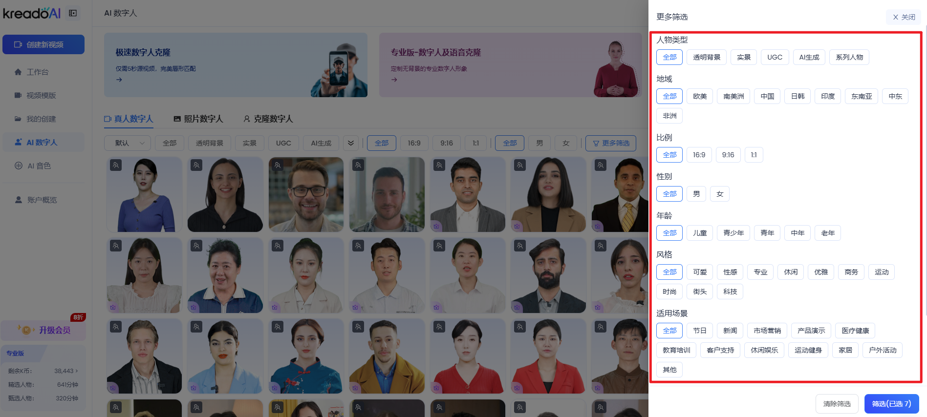 登陆KreadoAI官网,进入 “真人数字人” 板块,点击 “更多筛选”,即可按以下维度精准匹配数字人形象: