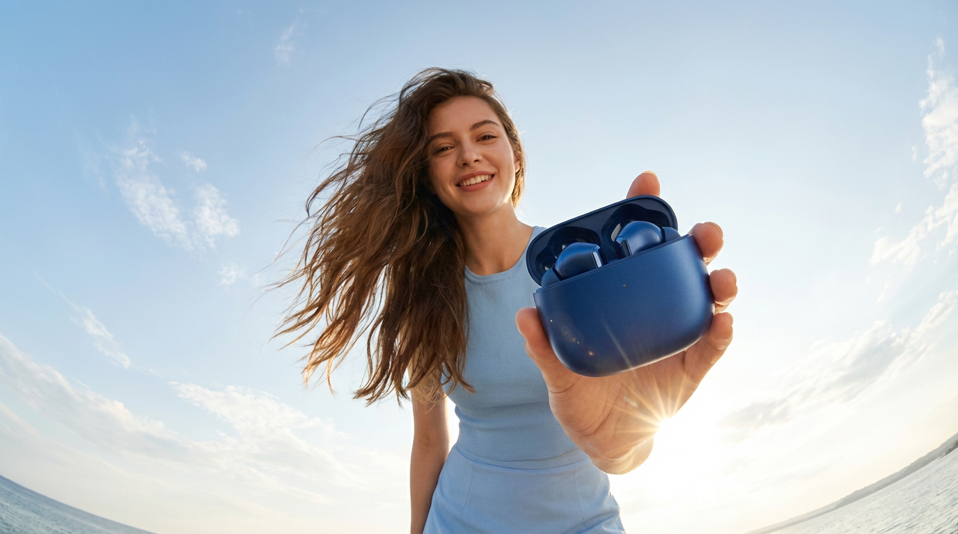 【详细示例】超大广角镜头,夸张透视,仰视视角,背景光影强烈,画面为数码产品广告场景,浅蓝色天空点缀几缕白云,营造清新氛围。画面中,一位年轻漂亮的女孩穿着浅蓝色无袖上衣和短裙,长发随风轻扬,面带微笑,姿态舒展自然。她左手前伸,掌心托着一个深蓝色的耳机充电盒,充电盒设计精致,质感光滑,造型独特,成为画面视觉焦点,吸引观者目光。