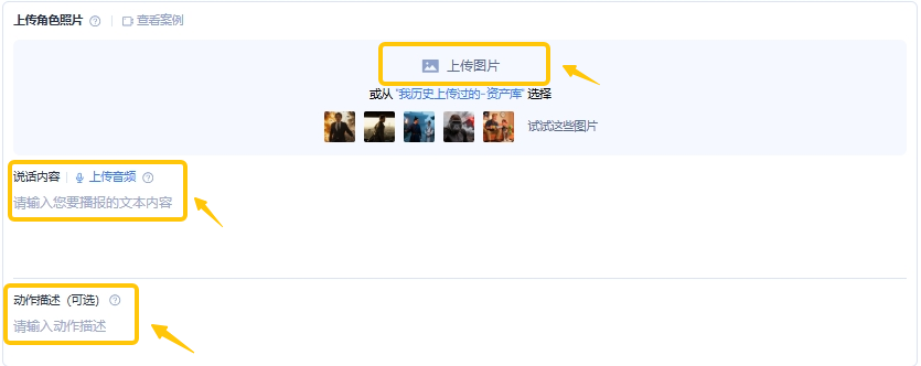 1.上传备好的图片和音频,粘贴说话内容或动作提示词 — 当前“动作描述”支持英语、中文、日语、韩语、西班牙语(墨西哥)、印尼语等六大语言;