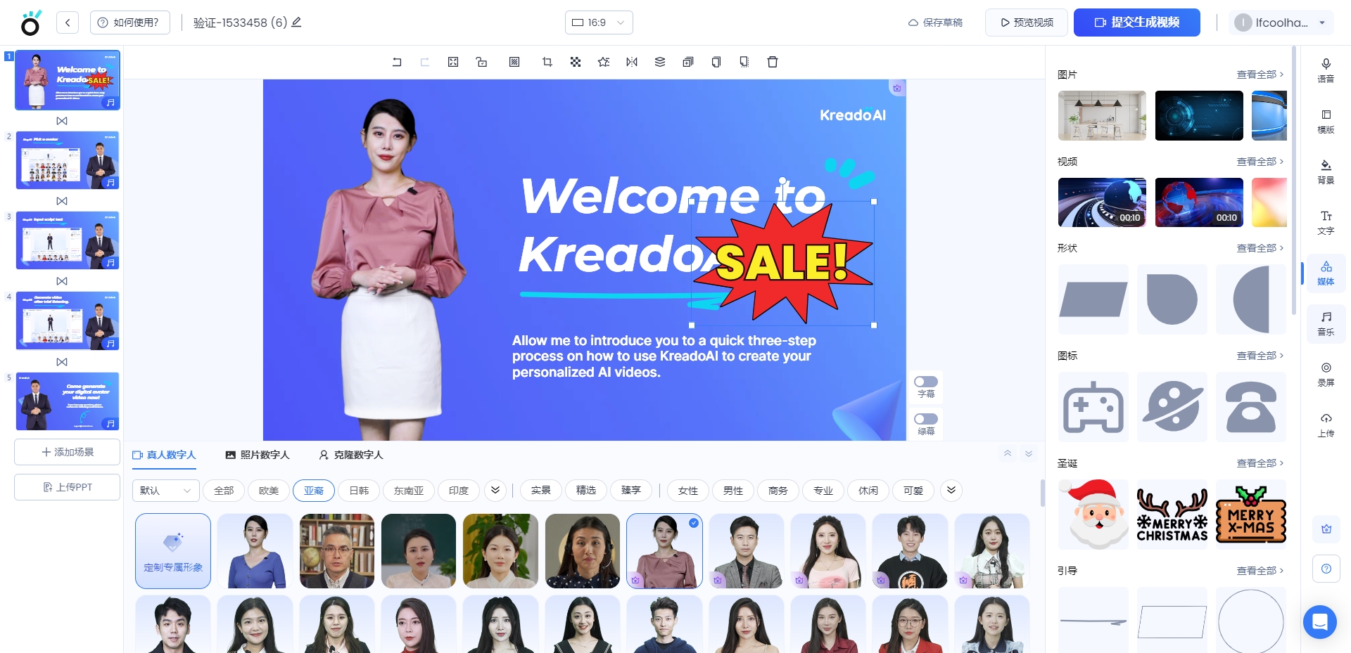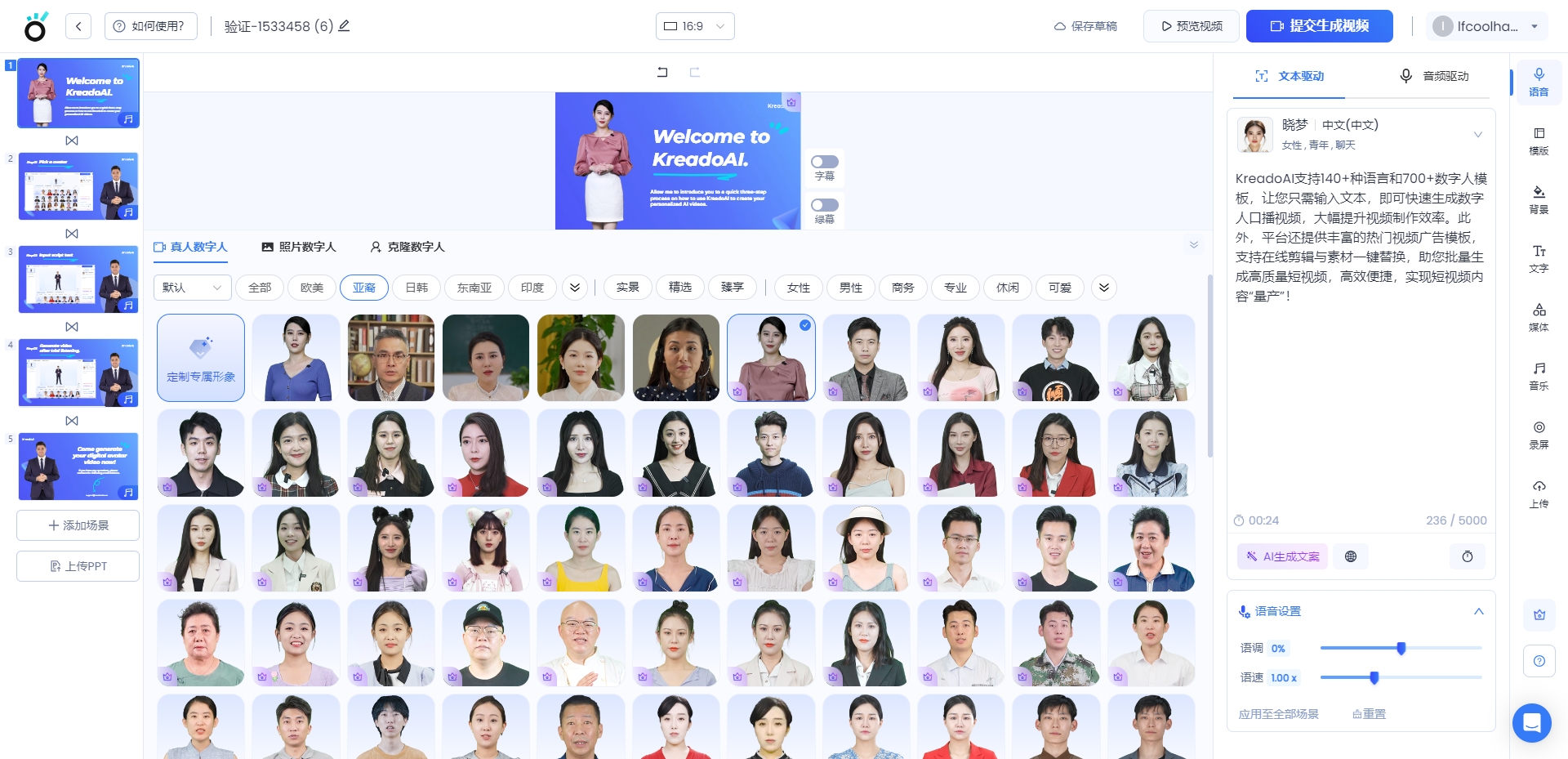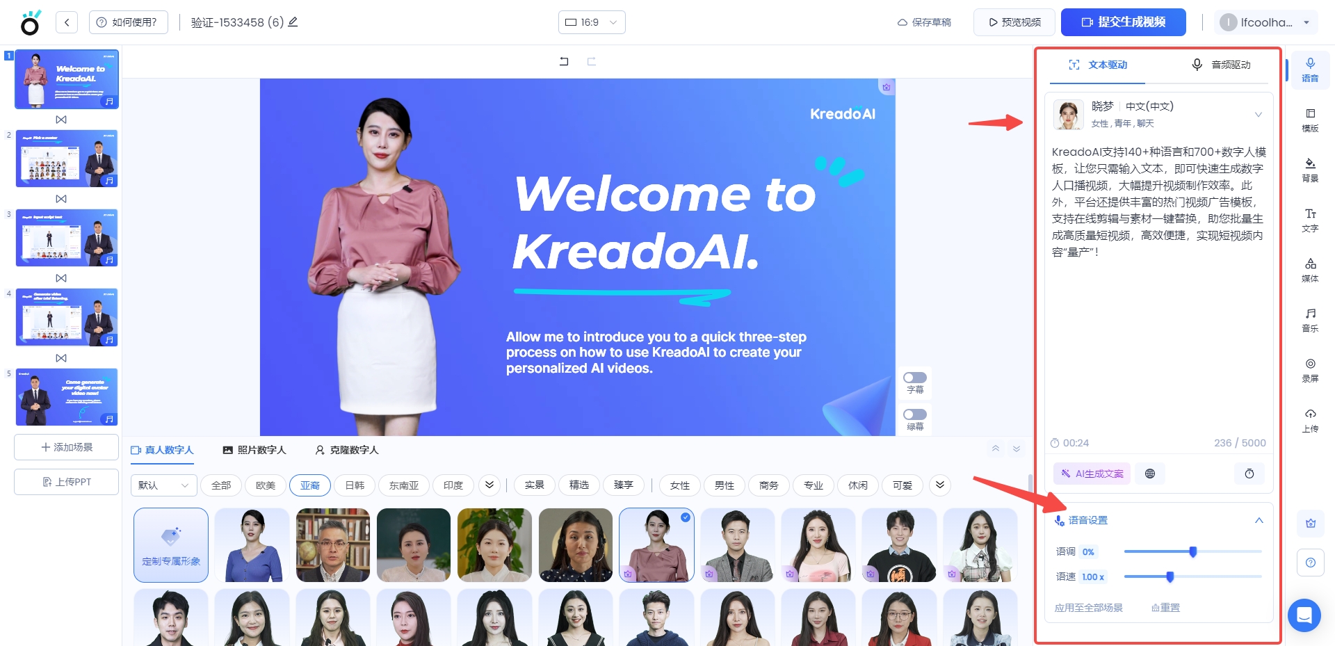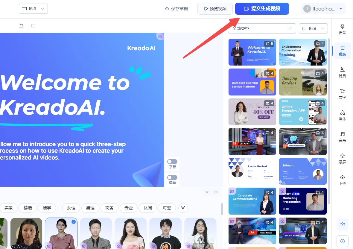 KreadoAI支持140+种语言和700+数字人模板,让您只需输入文本,即可快速生成数字人口播视频,大幅提升视频制作效率。