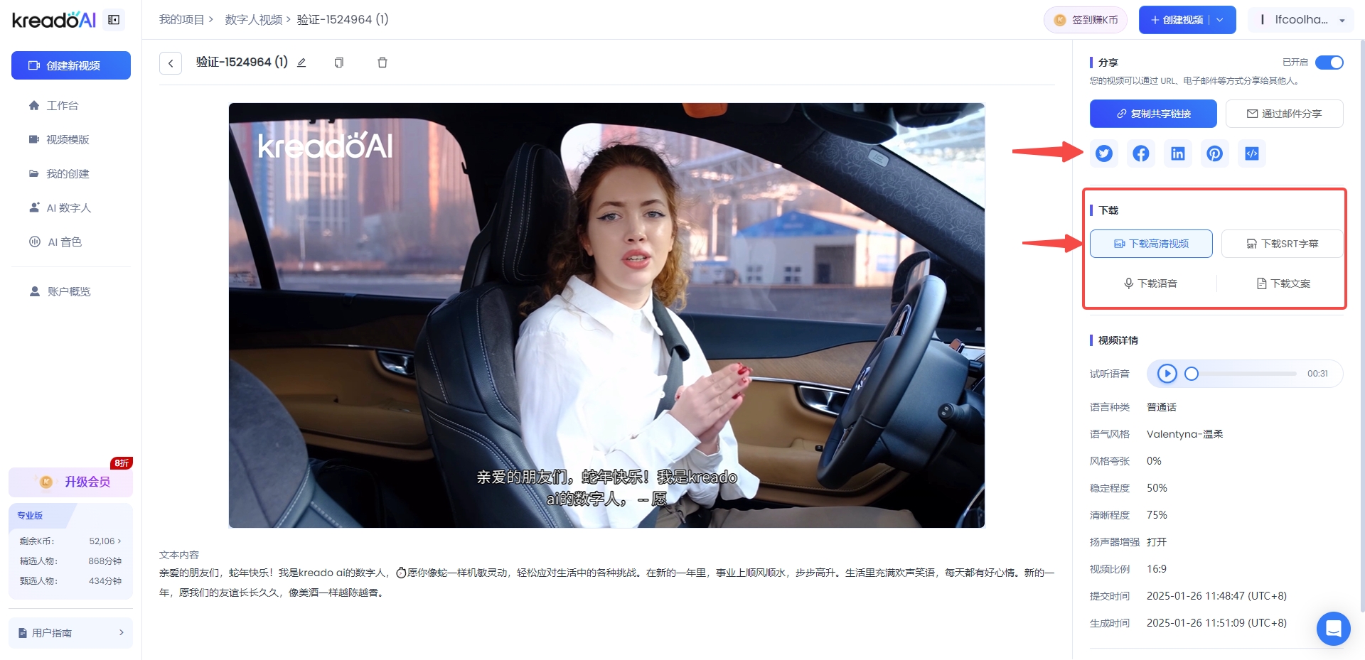 进入“我的创建”,点击下载按钮即可保存视频。
