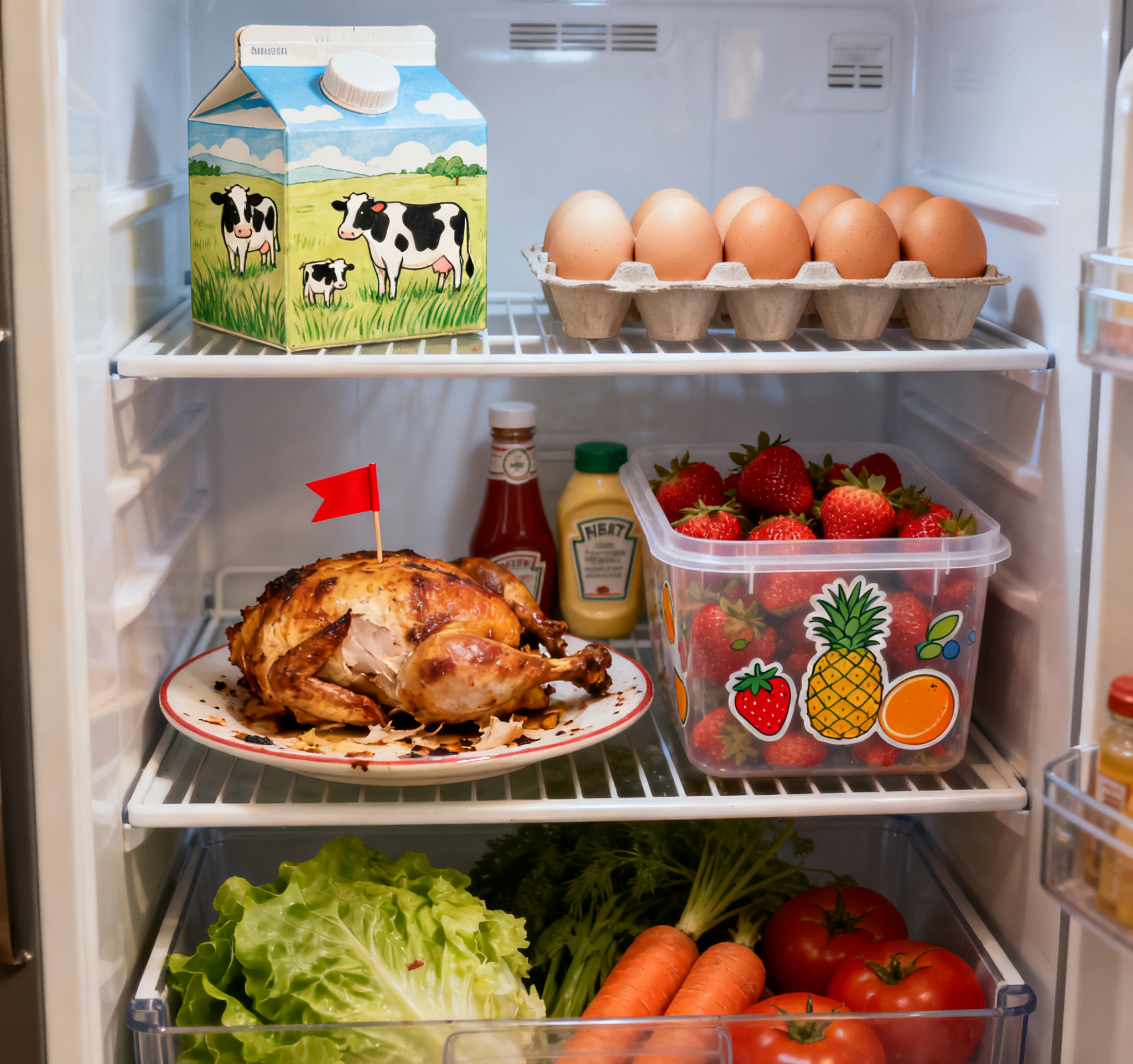 【提示词】冰箱打开的内部视图:上层: 左边放着一盒牛奶,牛奶盒上绘制了三只大小不一的奶牛,在草原上吃草,右边是一个鸡蛋支架,里面放着八个鸡蛋。中层: 一个盘子,里面装着吃剩的烤鸡,烤鸡上插着一个红色的小旗帜,旁边是一个装满草莓的透明保鲜盒,盒子上绘制有菠萝、草莓和橙子的图案。 下层: 蔬菜抽屉里有生菜、胡萝卜和西红柿。冰箱门后面的置物架里放着番茄酱和蛋黄酱。