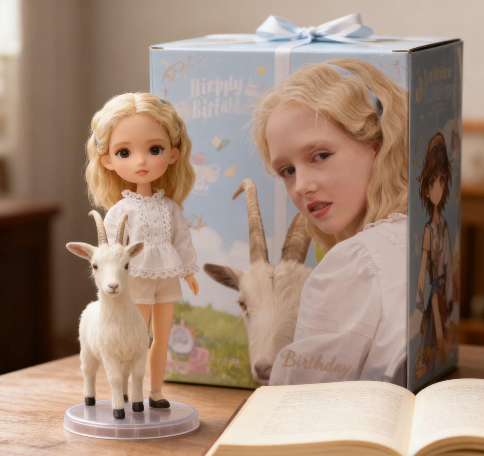 【提示词】参考图中的人物形象,做一个人物手办,放在桌上,后面放置一个印有角色图像的生日礼物包装盒,盒子下面有一本书,在包装盒前面,添加一个圆形塑料底座,角色手办站在上面,将场景设置在室内,尽可能真实;生成尺寸和现在图一样;手办在图片的左边;整个图片的风格和原始图一样,大片摄影感。