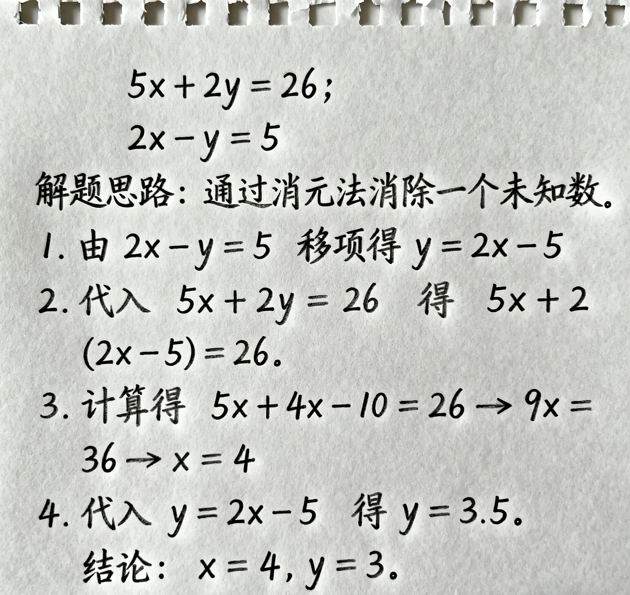 【提示词】在一张纸上写出下列二元一次方程组及其相应的解法步骤:5x + 2y = 26;2x - y = 5。