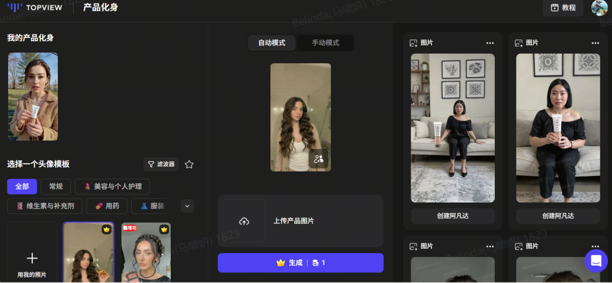 TopView AI 也提供虚拟人物用于视频讲解,但更多作为【信息承载工具】,人物可定制空间有限,更适合快速生成标准广告素材。