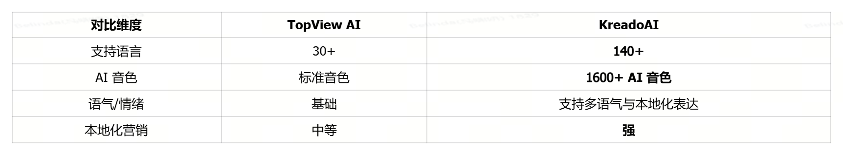 TopView AI 也支持多语言配音,能够满足基础国际营销需求,但在语言覆盖广度与语音风格多样性方面不及 KreadoAI。