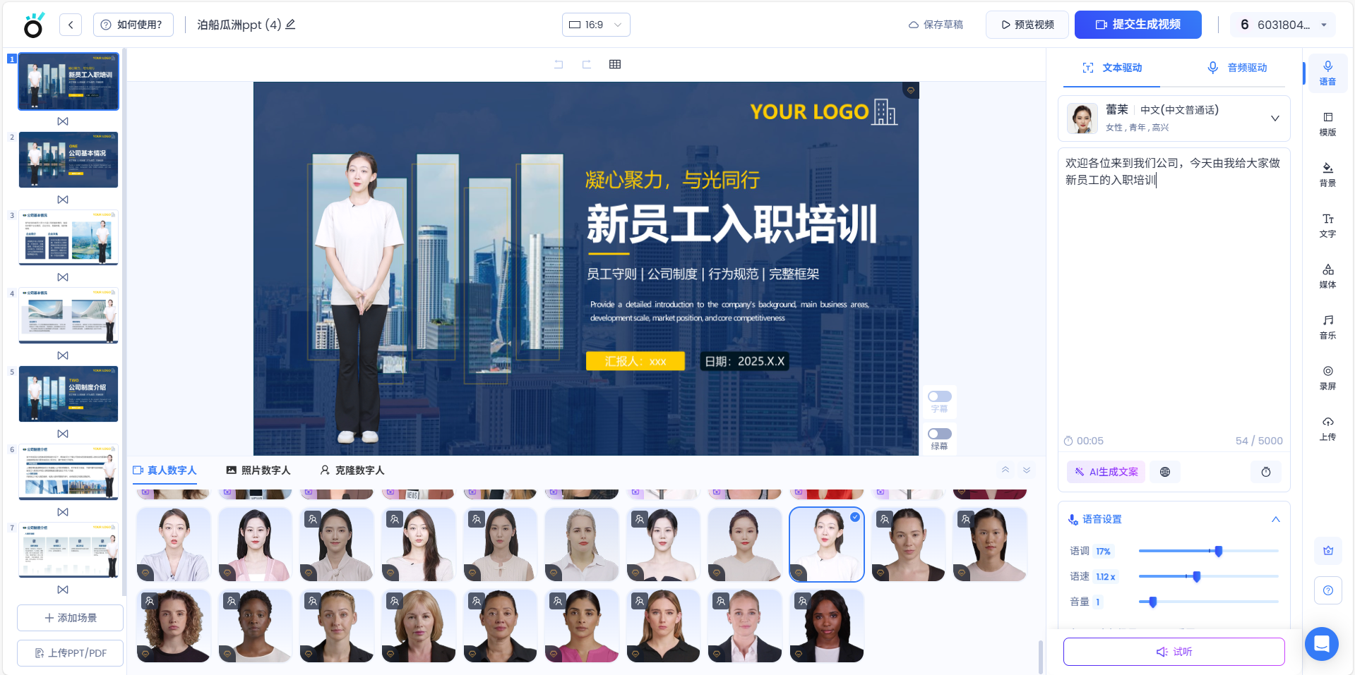 通过AI数字人演示技术,企业可以快速将内部培训PPT转化为专业的AI智能讲解视频,数字主持人能够以统一的标准准确传达公司制度、业务流程和企业文化。这种创新的PPT视频制作方式不仅确保了培训内容的一致性,还能大幅降低培训成本,提高培训效率,特别适合跨地区大型企业的标准化内部沟通。