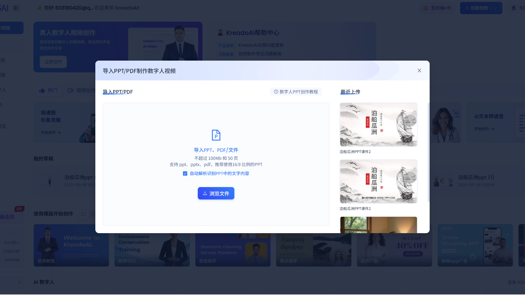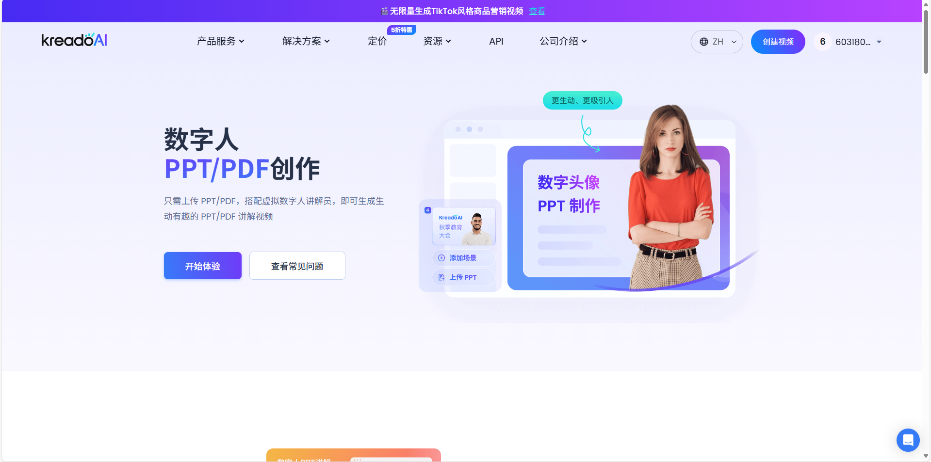 打开KreadoAI主页,找到「数字人PPT」功能入口,这是您开启智能视频制作的第一步。