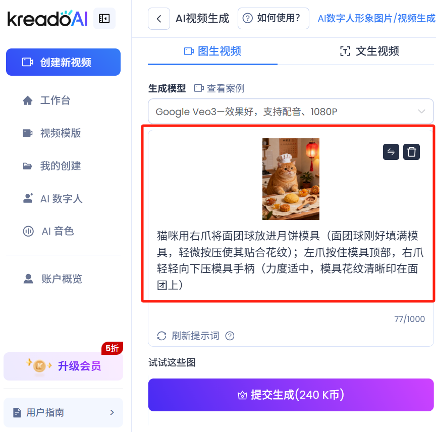 从揉面、包馅、压模到吃月饼,KreadoAI图生视频帮我完成了一只猫咪过中秋节的全流程。像这样的创意视频是怎么做的?三步教会你!